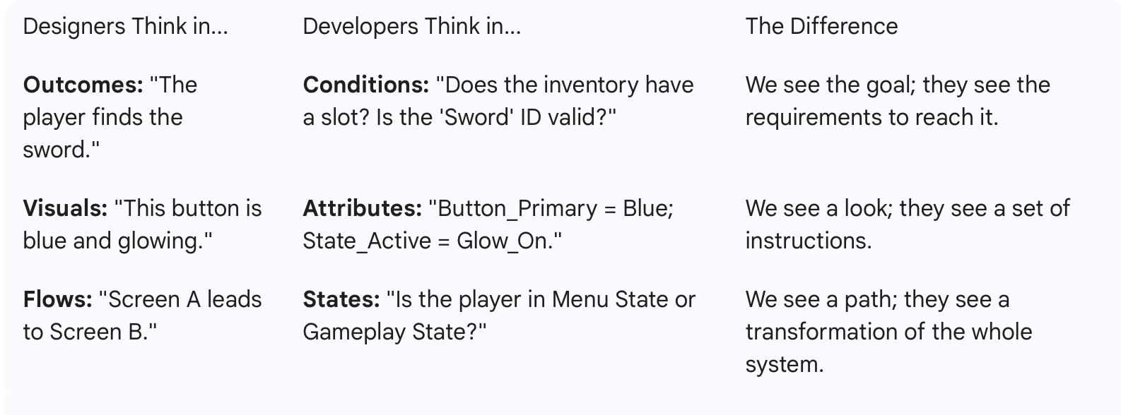 Design for the system, not the screens. A screenshot is a moment in time; a system is a living thing. Think variables and logic instead of just pixels. While designers usually focus on the User Journey (how someone feels and moves) developers focus on Architecture (how the data lives and reacts).